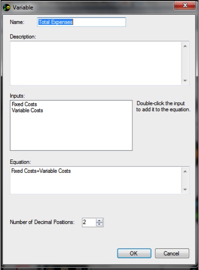 The rest of the Variable properties can now be populated. The "Inputs" field will populate according to how the Variable is influenced by the objects connected to the Variable.